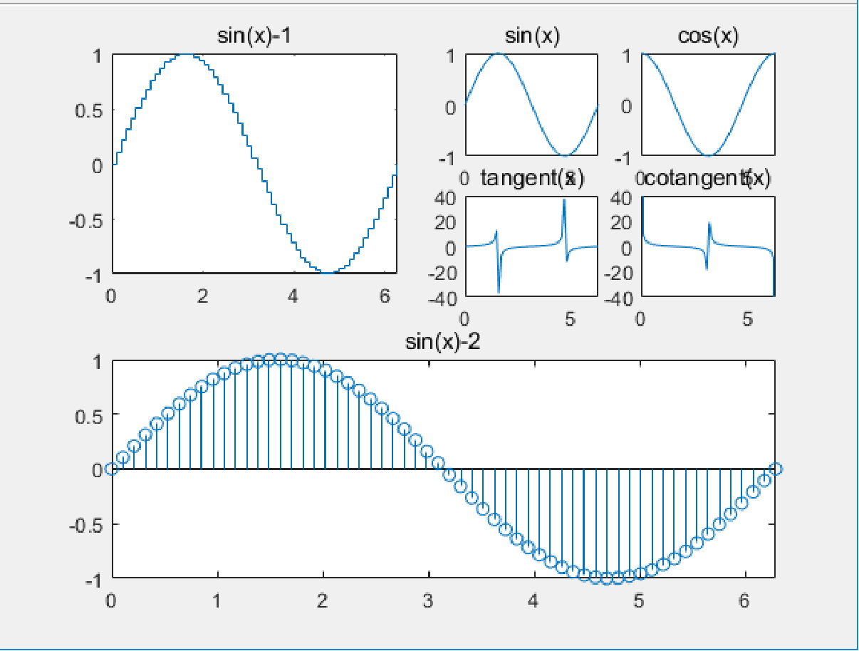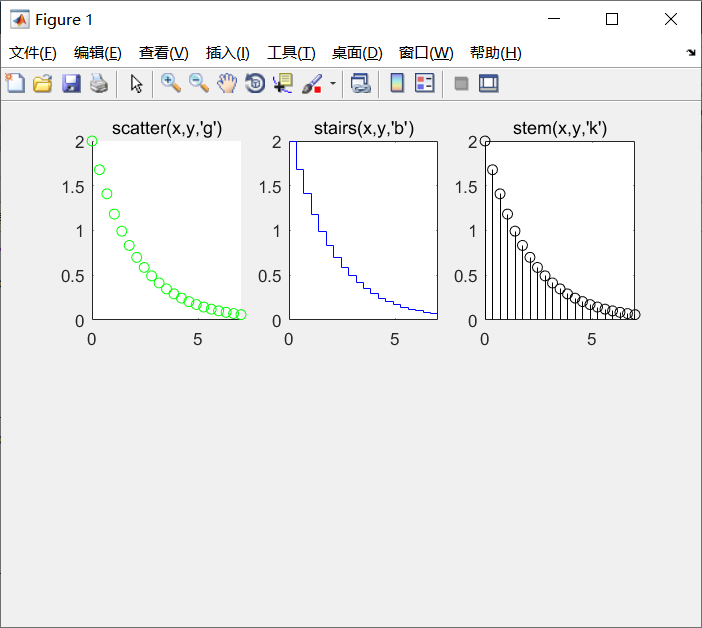 3个函数的调用格式为: scatter(x,y[,'filled'][,颜色]) stairs(x,y,选项) stem(x,y,选项)