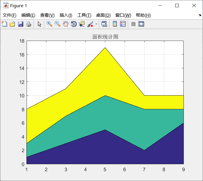 在MATLAB中,绘制面积统计图的函数是area,其调用格式为: ① area(x)。 ② area(x,y)