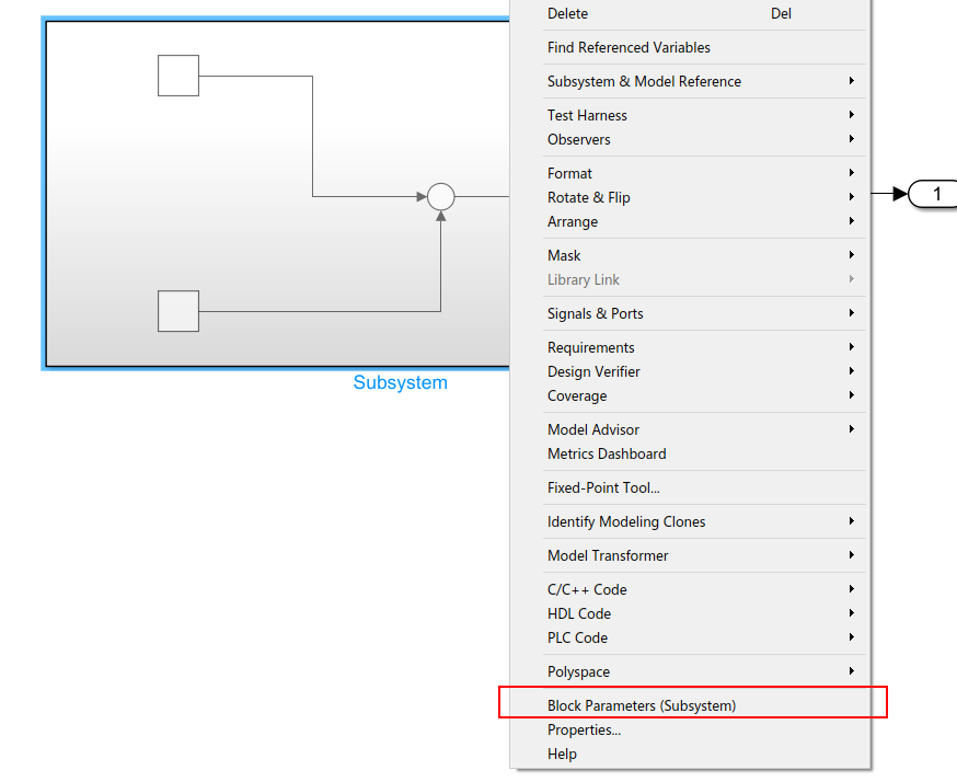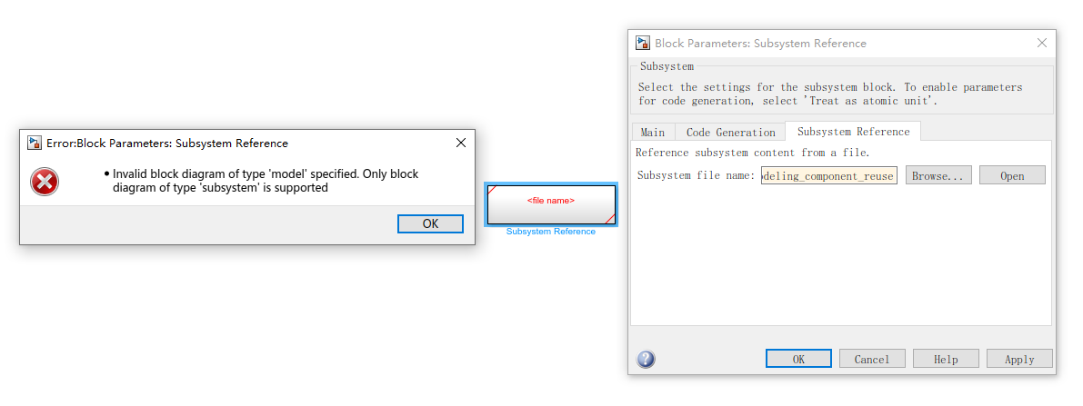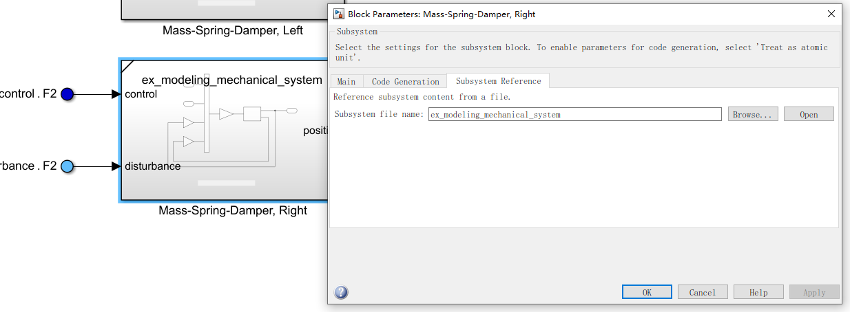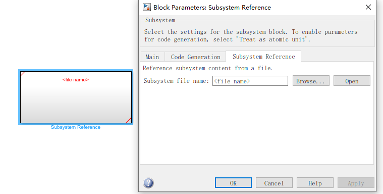 在子系统上点击右键,选择子系统模块的参数,就可以看到这个Subsystem Reference的功能,可以看到它这里是通过文件名链接到了之前创建的子系统模型上了。接下来我们看看如何实际自己去创建和引用。