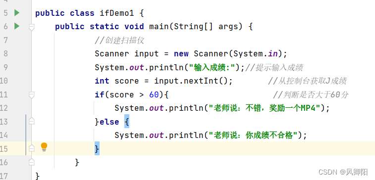 解析: 输入成绩后,通过判断得知时候大于 60分。若大于60分,则会输出“老师说:不错,奖励一个MP4”,否则,也就是当成绩小于60分,则会输出“老师说:你成绩不合格”