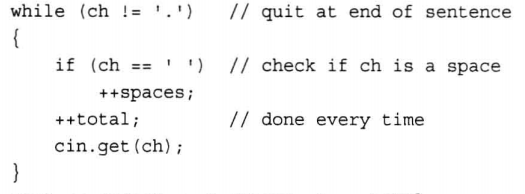 当且仅当ch为空格时,语句++space;才被执行。因为语句++total;位于if语句的外面,因此在每轮循环中都将被执行