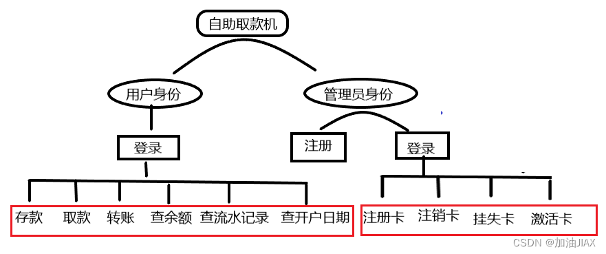 本次C语言项目目标为通过C语言模拟实现自助取款机功能,无图形化界面。通过打印选项与提示,用户通过键盘输入,实现人机交互。人物角色分为两类:管理员与用户。管理员先进行注册,完成后登录,根据用户信息进行卡的注册、挂失、激活和注销等操作;用户通过卡号和密码登录账号,进行存款、取款、转账等操作。
