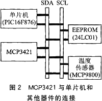 MCP3421与具有I2C接口的单片机的连接方式非常简单。图2所示的单片机测量系统中,MCP3421与其他器件(EEPROM、温度传感器)等共享I2C总线,并可以标准、快速或高速三种模式与单片机进行通信。由于I2C总线是一种漏极开路驱动,所以SCL和SDA线都需要上拉电阻。上拉电阻的大小取决于总线的工作速率和总线电容。