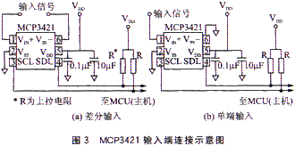 MCP3421提供全差分输入。外部输入信号可连接到VIN+和VIN-输入引脚。