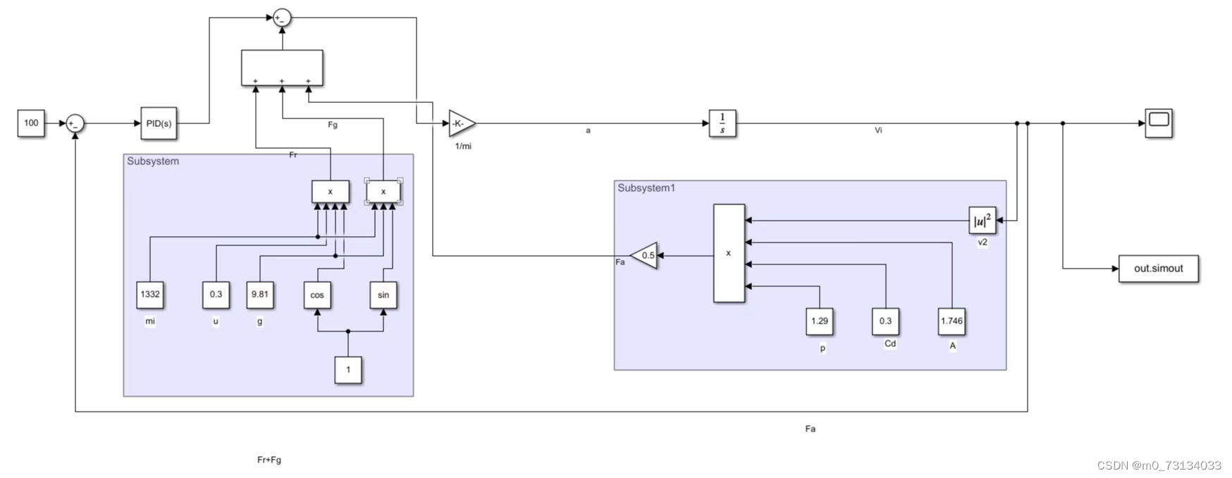 将汽车动力仿真模型建成子系统与PID控制仿真模型做最后的仿真连接,得到总的仿真模型如图2.5-3,2.5-4