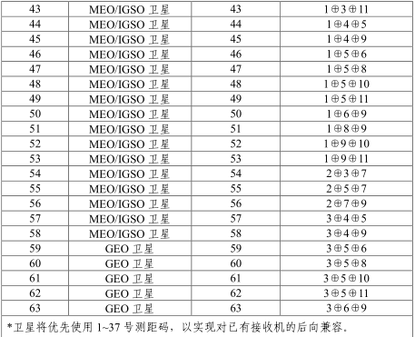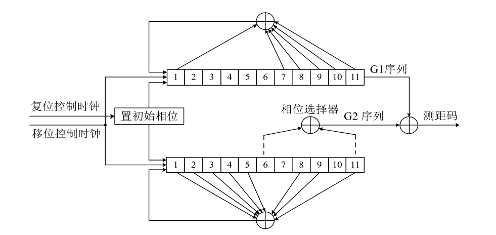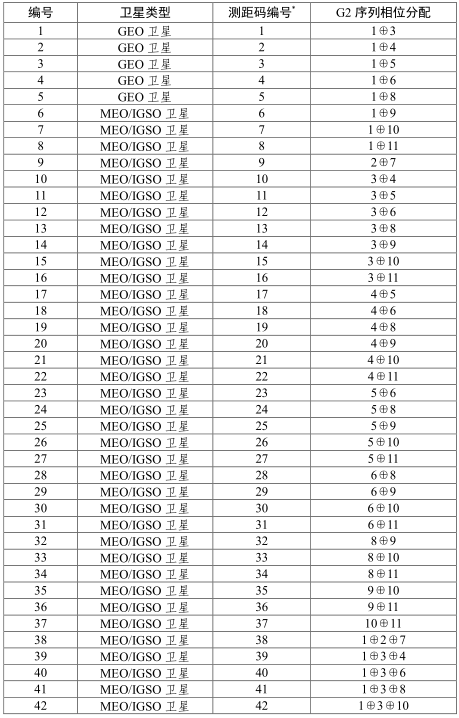 通过对产生 G2 序列的移位寄存器不同抽头的模二加可以实现G2 序列相位的不同偏移,与 G1 序列模二加后可生成不同卫星的测距码。G2 序列相位分配如表: