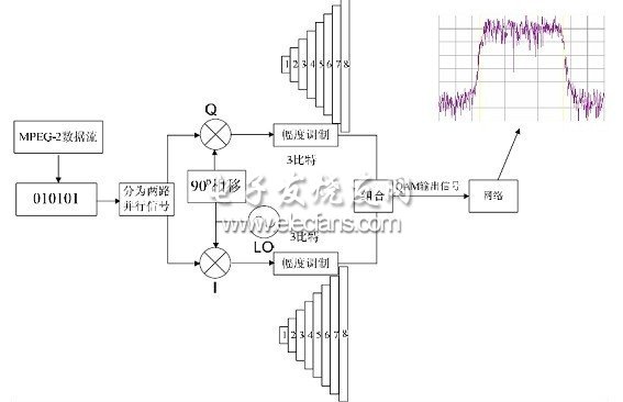 以上就是QAM调制的基本原理。经过信道编码的二进制的MPEG-2比特流进入QAM调制器,信号被分为两路,一路给I,另一路给Q,每一路一次给3比特的数据,这3比特的二进制数一共有8种不同的状态,分别对应8种不同的电平幅度,这样I有8个不同幅度的电平,Q有8个不同幅度的电平,而且I和Q两路信号正交。这样任意一个I的幅度和任意一个Q的幅度组合都会在极坐标图上映射一个相应的星座点,这样每个星座点代表由6个比特的数据组成的一个映射,I和Q一共有8×8共64种组合状态,各种可能出现过的数据状态组合最后映射到星座图上为图5所显示的64QAM星座图。