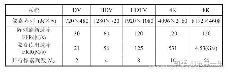 在CMOS图像传感器集成电路上,并行列输出的像素模拟信号,通过集成在同一芯片上的Ncol组模数转换器(ADC)转换成数字信号,然后利用先进的高速并行数据传输标准,输出数字图像数据到芯片引脚上。表4.2列出像素阵列的刷新率、像素读出速率和图像阵列的并行像素列数。在高清晰度和高刷新率要求下,只有高并行像素列数NPC,才能传输和处理高达吉比特每秒(Gb/s)的图像信号数据率。