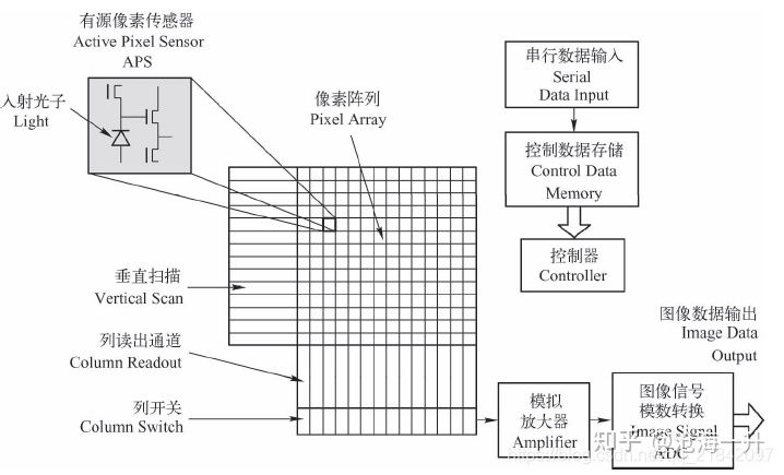 一个典型的CMOS图像传感器结构如下图所示。这个结构包括由有源像素传感器(APS)构成的像素阵列(pixel array)、垂直扫描电路(vertical scan)、每一列像素共享的列读出通道和列选择开关、模拟图像信号放大器、模数转换器和图像数据输出等。控制器控制各个图像信息获取部件,进行所需要的曝光-读出同步操作。控制数据一般由外部通过串行数据输入端口(如IIC、SPI)输入,并存储在控制数据存储器中。