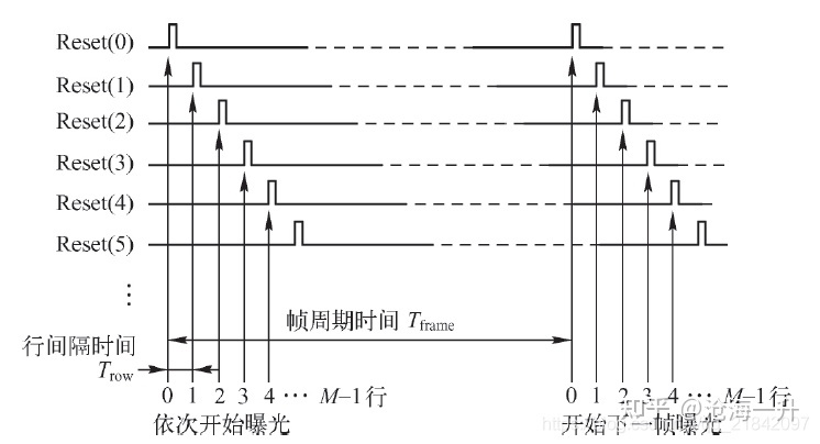 滚动快门(Rolling Shutter)曝光是CMOS图像传感器阵列最基本的工作方式之一。如前所述图像阵列的重置、传输和选择是按行操作的,在滚动快门曝光的开始,每一行的重置控制信号Reset(0)、Reset(1)、Reset(2)、…、Reset(N-1),依次间隔相同的Trow时间,开启重置执行曝光开始操作,直到阵列所有的行都开始曝光。