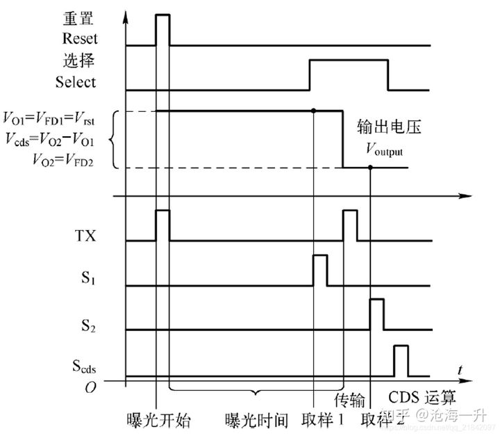 相关双取样(Correlated Double Sampling,CDS)电路不是直接测量阵列中每个像素曝光完成后的输出电压,而是在每个像素曝光过程中测量两次输出电压: