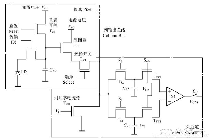 以4T-APS像素为例,一般采用差分电路读出,结构如下图