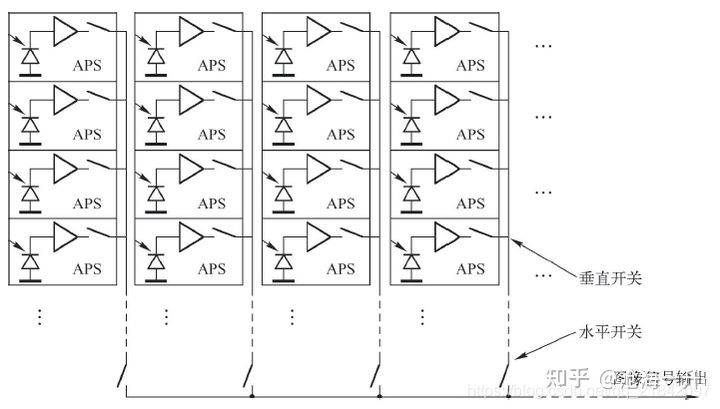 CMOS图像传感器最重要的特点就是在像素阵列中采用了有源像素传感器(Active Pixel Sensor,APS)。APS像素上集成了光电二极管(PD)、有源的晶体管开关和放大电路,通过这些有源电路在每个像素上已经完成了电荷-电压的转换,并放大成有驱动能力的信号电压。然后用常规的电子电路方法把像素信号切换到传感器外面,实现图像信号的扫描输出。