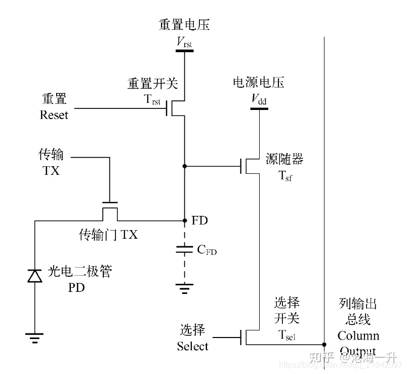 最简单的也是最基本的有源像素传感器(APS)由三个晶体管和一个光电二极管构成,用英文缩写3T-APS表示。这种像素的电路如图所示,其中Trst是重置开关晶体管,Tsf是源极跟随器,Tsel是选择开关晶体管,以及作为光电转换用的光电二极管PD。