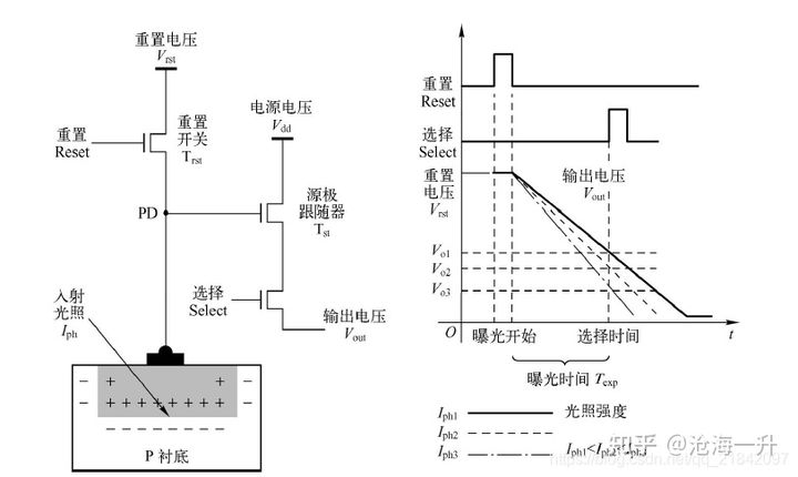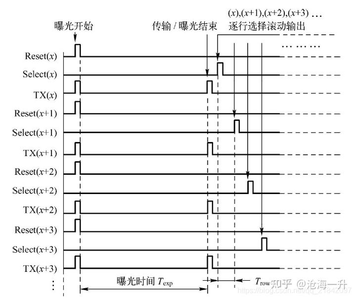 从重置信号(Reset)结束,到选择信号(Select)开始之间的时间为像素的曝光时间Texp。