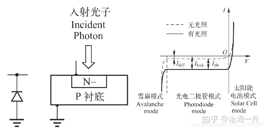 当入射光子照射在半导体材料的PN结上,如果在PN结上施加电压使光生载流子形成电流,产生如图所示的I-V 特性曲线。曲线上V>0的正向偏置一段被称为太阳能电池模式;PN结反向偏置V<0的平直一段曲线,被称为光电二极管模式;I-V特性的反向击穿段被称为雪崩模式。通常在图像传感器中,光电转换元件工作在光电二极管模式。图中PN结的反向电流Ileak为Ileak=Iph+Idiff。式中,Iph为光生流子产生的电流;Idiff为扩散电流。在完全没有光照的情况下Iph=0,Ileak=Idiff,被称为暗电流或者漏电流。