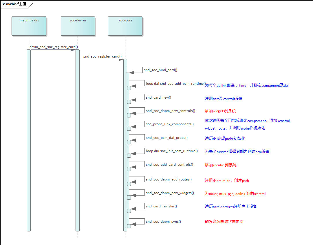 Machine驱动注册通过devm_snd_soc_register_card实现,PCM创建部分查看下图蓝色字体,红色字体为DAPM部分后面分析。