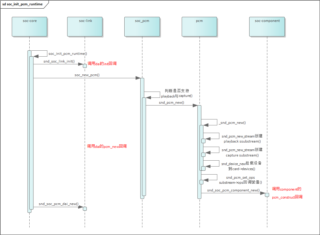 soc_init_pcm_runtime函数实现PCM设备的创建与初始化,生成的设备用于PCM数据流控制,分析如图2.2.