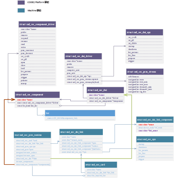 ALSA涉及很多结构体,大致梳理了其中的关系如图2.4所示。Machine驱动起总领作用,通过搜索component_list并比较name/dai_name与codec/platform驱动进行匹配。