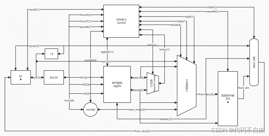 各个模块功能: pc:更新pc 指令IM:指令寄存器 寄存器堆regfile:从此获取32个寄存器存储内容 控制单元control:给出控制信号 比较器BranchComp:获取相应比较结果 计算器ALU:获取相应计算结果 数据寄存器DM:根据所给地址获得内存内容 MUX_WB:选择写回数据寄存器的内容 |