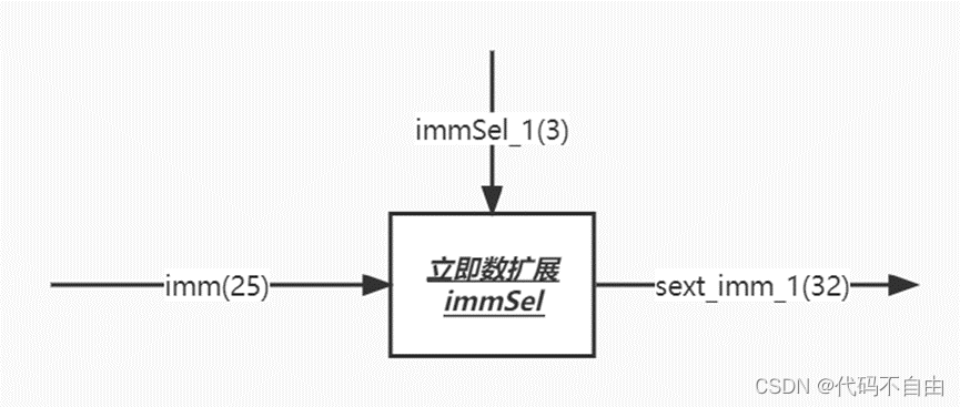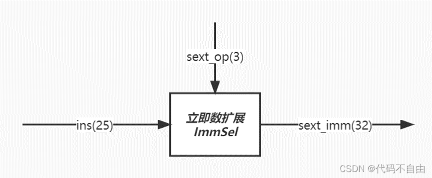 根据控制信号对25位的数ins进行相应立即数扩展为32位的sext_imm。当sext_op为`I_SEXT时,进行I型立即数扩展;当sext_op为`S_SEXT 时,进行S型立即数扩展;当sext_op为`B_SEXT,进行B型立即数扩展;当sext_op为`U_SEXT 时,进行U型立即数扩展;当sext_op为`J_SEXT 时,进行J型立即数扩展;其余情况默认设置sext_imm为0。