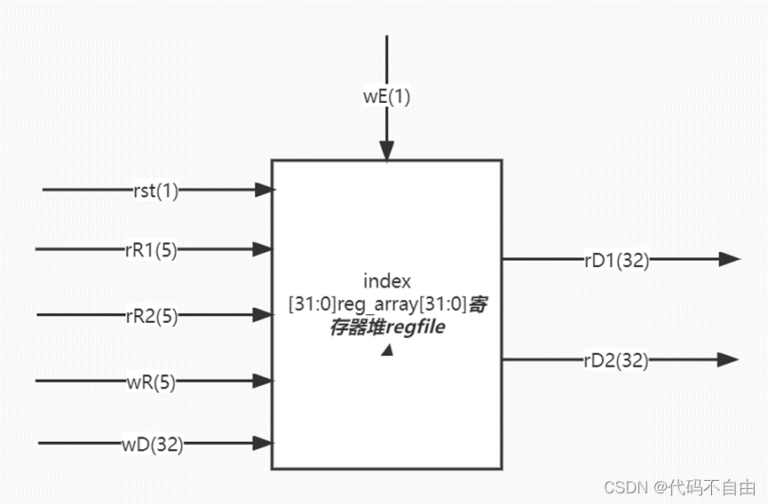 读寄存器采用时序逻辑,每个时钟下降沿来临时,若rR1不是0号寄存器,将其中存储的内容赋给rD1,否则将rD1设为0;若rR2不是0号寄存器,将其中存储的内容赋给rD2,否则将rD2设为0。 写寄存器采用时序逻辑,每个时钟上升沿来临时,0号寄存器reg_array[0]恒设为0,复位信号有效时,所有寄存器设为0。不复位时,若写寄存器堆信号有效,即wE为1时,且目标寄存器不是0号寄存器,则将reg_array[wR]设为wD。
