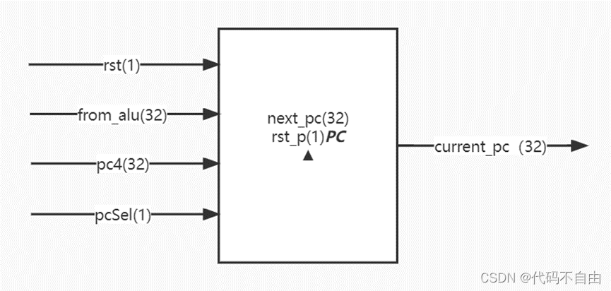 next_pc的赋值采用组合逻辑,当pcSel为0时表示跳转,被赋为计算出来的地址from_alu;当pcSel为1时表示不跳转,被赋为pc4(恒为pc+4)。复位信号rst无效一个时钟周期后的时钟上升沿信号rst_p无效。current_pc的赋值采用时序逻辑,在每个时钟上升沿,当rst_p有效时,被赋值为0;无效时,被赋值为next_pc。以实现pc的更新。