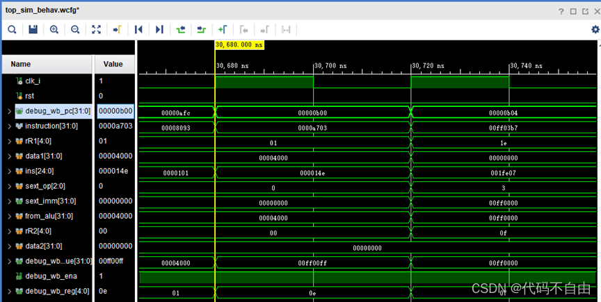 b00: 0000a703 lw x14,0(x1) 在时钟上升沿获得当前pc后,从IM取出指令instruction,分析指令。从寄存器堆中取出寄存器rR1,即1号寄存器的内容作为ALU的第一个操作数,即a=0x4000;同时由sext_op=0,判断将指令后25位做I型立即数扩展,得到32位的立即数sext_imm作为ALU的第二个操作数,即b=0。两操作数在ALU中做加法操作得到结果,即from_alu=0x4000。该结果作为内存地址,取出该地址中存储的内容0xff00ff写入14号寄存器。