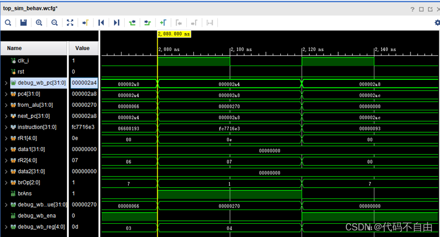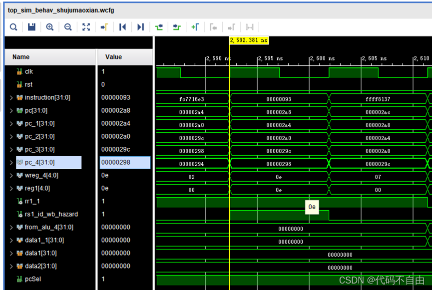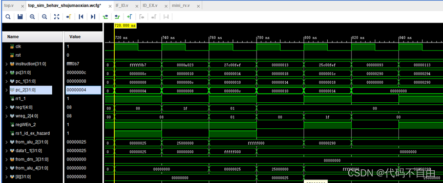 298: 00208733 add x14,x1,x2 29c: 00000393 addi x7,x0,0 2a0: 06600193 addi x3,x0,102 2a4: fc7716e3 bne x14,x7,270 <fail> RAW情形C: 我采用前递解决该数据冒险。当第一条指令进入WB阶段、第四条指令在ID阶段时,检测到RAW情形C(rs1_id_wb_hazard=1) ,于是采用组合逻辑直接将WB阶段ALU计算结果from_alu_4前递给data1_1,在下一个时钟周期直接作为BranchComp的第一个操作数,以保证第四条指令比较结果的正确。故一个时钟周期后,BranchComp中两操作数data1=data2,指令不跳转(pcSel=1)。 |