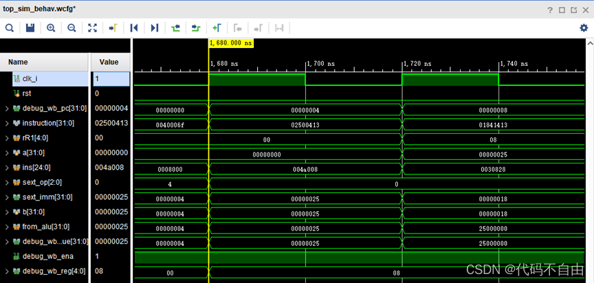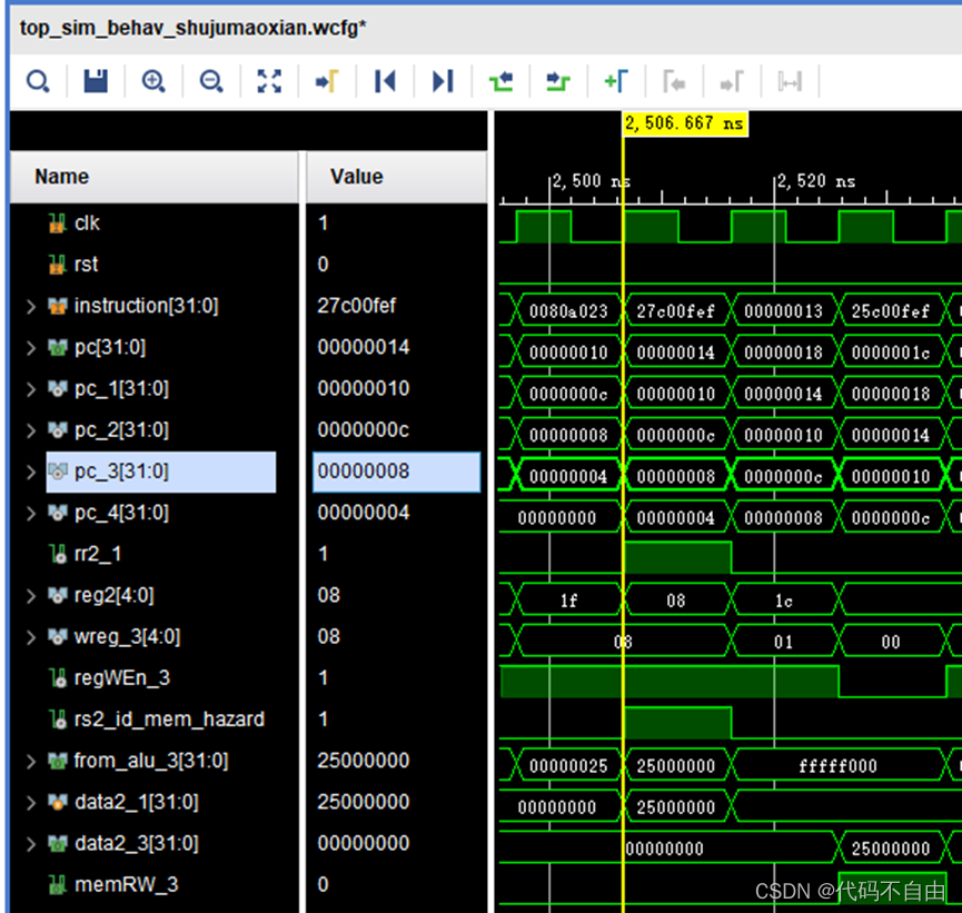 控制冒险: 0: 0040006f jal x0,4 <reset_vector> 4: 02500413 addi x8,x0,37 我采用静态预测解决控制冒险,总是预测跳转。图中当第一条指令到达EX阶段(pc_2=0x0)时,得知下条指令该跳转(pcSel=0),跳转目的地址为from_alu_2=0x4,预测错误,一个时钟周期后,pc=0x4,清空IF/ID流水级(pc_1=0)、ID/EX流水级(pc_2=0),ID、EX阶段的指令设为无效(useful_1=0、useful_2=0)。在经过四个时钟周期后,第二条指令执行完成,又一个时钟周期后将其计算结果0x25写入寄存器reg8。