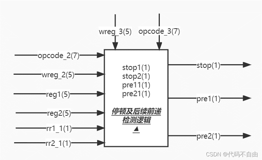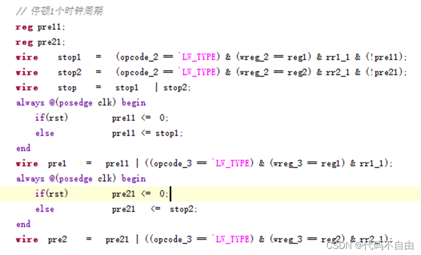 当EX阶段正在执行取数指令(opcode_2==`LW_TYPE),EX阶段的写回寄存器与ID阶段要读取的寄存器reg1/reg2相同(wreg_2==reg1/reg2且rr1_1/rr2_1,其中rr1_1/rr2_1表示ID阶段要读取寄存器reg1/reg2)时,说明此时EX阶段和ID阶段的两条指令发生载入-使用型数据冒险,采用组合逻辑,赋stop1/stop2=1,而停顿信号stop=stop1|stop2,得知此时得停顿。pre11和pre21的赋值采用时序逻辑,复位信号无效时,在每个时钟上升沿将pre11<=stop1、pre21<=stop2。停顿一个时钟周期后,利用pre11或pre21的改变将stop变回0,以实现只停顿一个时钟周期。同时采用组合逻辑,赋停顿后续前递信号pre1pre2为pre11pre21,或着当MEM阶段正在执行取数指令(opcode_3==`LW_TYPE),MEM阶段的写回寄存器与ID阶段要读取的寄存器reg1/reg2相同(wreg_3==reg1/reg2且rr1_1/rr2_1,其中rr1_1/rr2_1表示ID阶段要读取寄存器reg1/reg2)时,将pre1pre2赋为1。停顿操作在部分部件设计中说明。 代码如下: