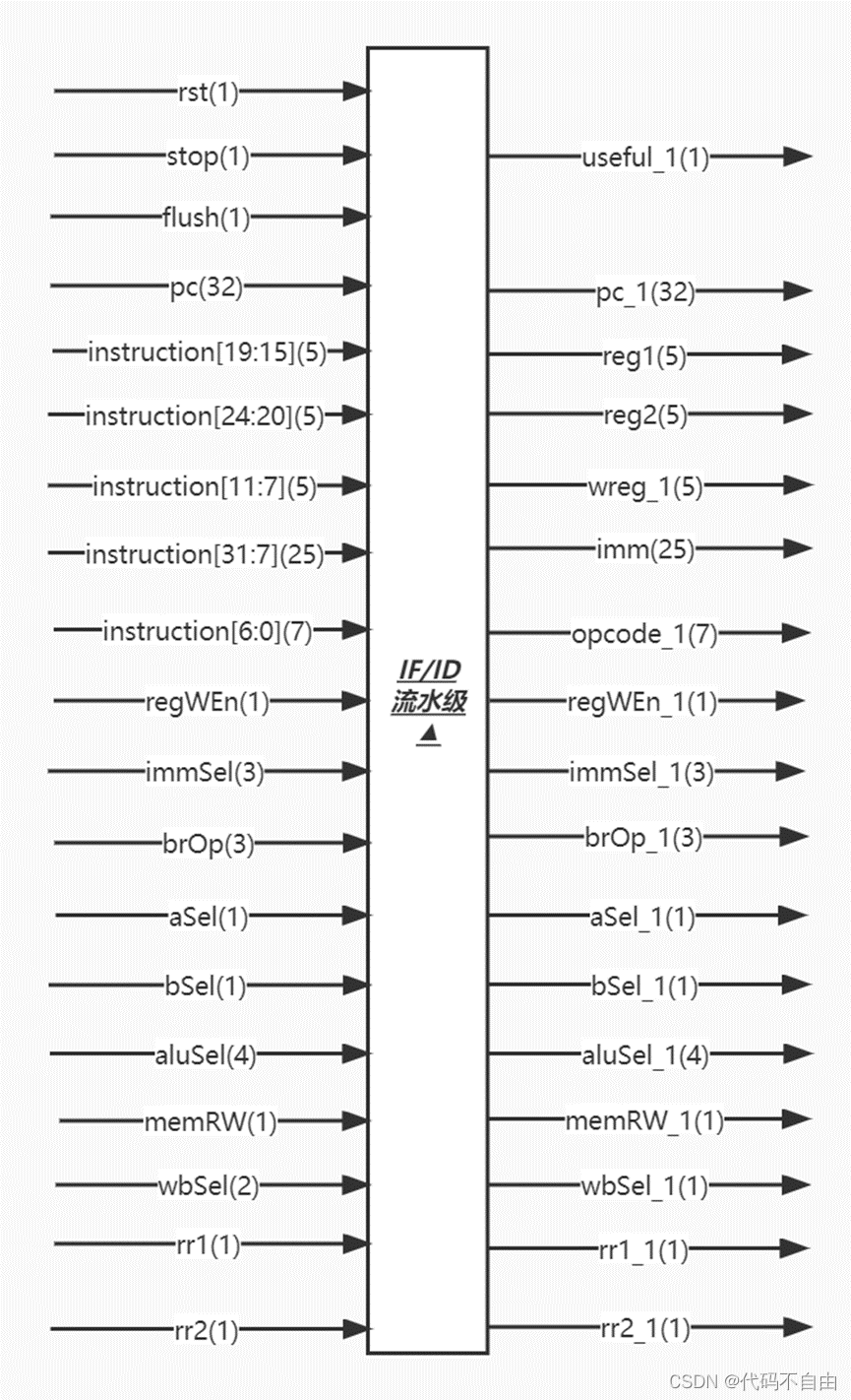所有输出信号的更新均采用时序逻辑,在时钟上升沿来临时: 当复位信号有效,即rst=1时,或要清空流水级,即flush(EX阶段得到的pcSel)=0时,要将相应的寄存器清零,useful_1设为’b0;pc_1设为32'b0;reg1设为5'b0;reg2设为5'b0;wreg_1设为5'b0;imm设为25'b0;opcode_1设为7'b0;regWEn_1设为1;immSel_1设为'b111;brOp_1设为'b111;aSel_1设为1;bSel_1设为1;aluSel_1设为`NOOP;memRW_1设为0;wbSel_1设为`FROM_ALU;rr1_1设为0;rr2_1设为0。 当来自停顿判断逻辑的停顿信号有效,即stop=1时,所有输出信号保持。 其它情况默认,useful_1设为’b1;pc_1设为pc;reg1设为instruction[19:15];reg2设为instruction[24:20];wreg_1设为instruction[11:7];imm设为instruction[31:7];opcode_1设为instruction[6:0];regWEn_1设为regWEn;immSel_1设为immSel;brOp_1设为brOp;aSel_1设为aSel;bSel_1设为bSel;aluSel_1设为aluSel;memRW_1设为memRW;wbSel_1设为wbSel;rr1_1设为rr1;rr2_1设为rr2。