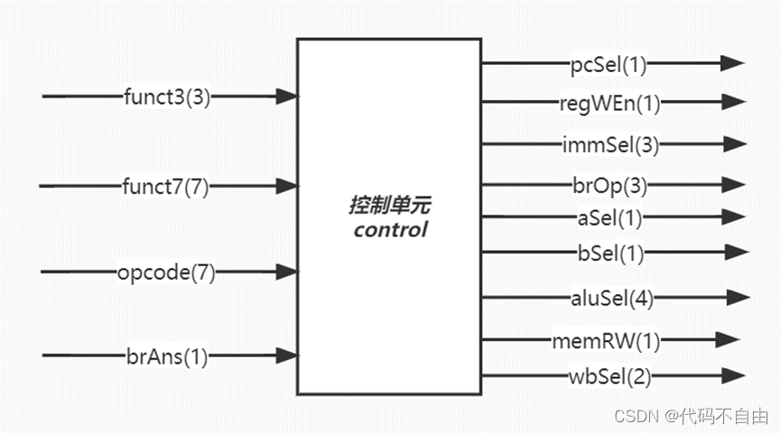 控制信号的赋值均采用组合逻辑。 》regWEn:当指令为S型指令或B型指令时,不写寄存器,regWEn设为0,否则设为1。 》immSel:根据opcode判断指令类型选择如何对立即数进行扩展。当指令为I型指令、LW指令、jalr指令时,immSel设为`I_SEXT;当指令为S型指令时,immSel设为`S_SEXT ;当指令为B型指令时,immSel设为`B_SEXT;当指令为U型指令时,immSel设为`U_SEXT;当指令为J型指令时,immSel设为`J_SEXT;其余情况默认immSel设为3’b111。 》brOp:当指令类型为B型指令时,比较器做何比较由funct3决定,直接将brOp设为funct3;其余情况默认brOp设为3’b111。 》aSel:根据指令类型判断ALU第一个操作数。当指令类型为B型指令或J型指令时, aSel设为0;否则aSel设为1。 》bSel:根据指令类型判断ALU第二个操作数。当指令类型为R型指令时, bSel设为0;否则bSel设为1。 》aluSel:当指令类型为R型指令时,根据funct3和funct7判断计算器进行的操作类型,分别将aluSel设为`SUB、`ADD、`AND、`OR、`XOR、`SLL、`SRL、`SRA,其它情况默认为`NOOP;当指令类型为I型指令时,根据funct3和funct7判断计算器进行的操作类型,分别将aluSel设为`ADD、`AND、`OR、`XOR、`SLL、`SRL、`SRA,其它情况默认为`NOOP;当指令为LW指令、jalr指令、S型指令、B型指令、J型指令时,aluSel设为`ADD;当指令为U型指令时,aluSel设为`LUI;其余情况默认aluSel设为`NOOP。 》memRW:根据指令类型判断读写内存。当指令类型为S型指令时需要写内存,memRW设为1;其余情况默认不写内存,设为0。 》wbSel:根据指令类型选择写回寄存器的内容。当指令类型为J型指令、jalr指令时, wbSel设为`PC4;当指令为LW指令时, wbSel设为`FROM_DM;其余情况默认wbSel设为`FROM_ALU。 》rr1:根据指令类型判断是否需要读取寄存器reg1中的内容。当指令为R型指令、I型指令、LW型指令、jalr指令、S型指令、B型指令时,rr1设为1;当指令为U型指令、J型指令时,rr1设为0;其他情况默认设为0。 》rr2:根据指令类型判断是否需要读取寄存器reg2中的内容。当指令为R型指令、S型指令、B型指令时,rr2设为1;当指令为I型指令、LW型指令、jalr指令、U型指令、J型指令时,rr2设为0;其他情况默认设为0。