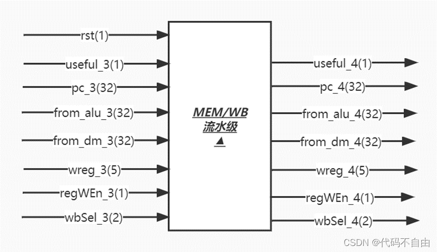 所有输出信号的更新均采用时序逻辑,在时钟上升沿来临时: 当复位信号有效,即rst=1时,useful_4设为’b0;pc_4设为32'b0;from_alu_4设为32’b0;from_dm_4设为32’b0;wreg_4设为5'b0;regWEn_4设为0; wbSel_4设为`FROM_ALU。 其余情况默认将useful_4设为useful_3;pc_4设为pc_3;from_alu_4设为from_alu_3;from_dm_4设为from_dm_3;wreg_4设为wreg_3;regWEn_4设为regWEn_3;wbSel_4设为wbSel_3。