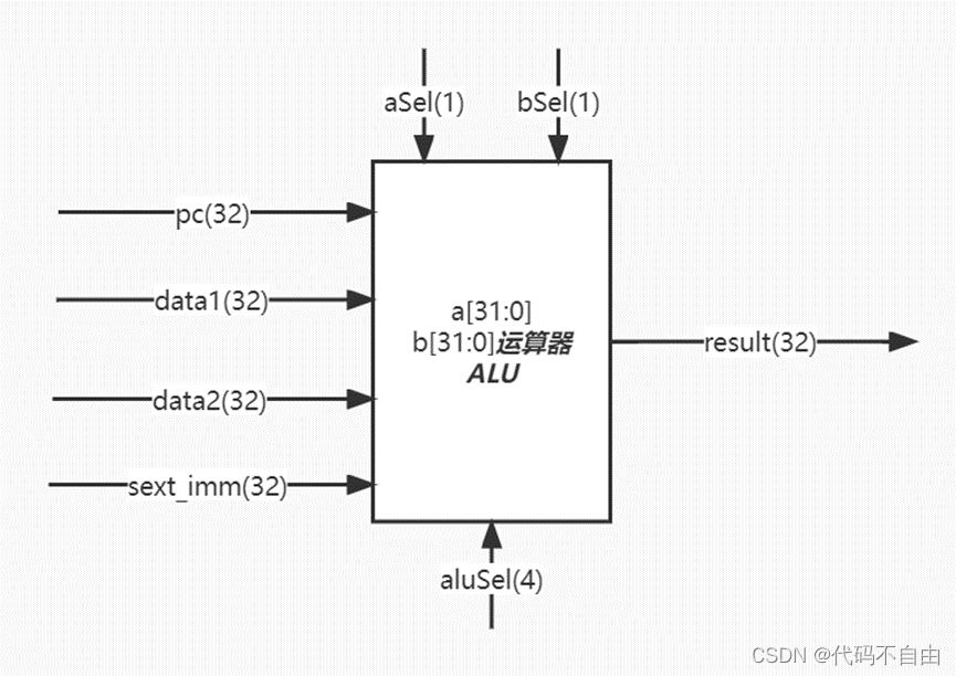 运算器采用组合逻辑。 aSel为0时,ALU第一个操作数a选择pc,为1时选择reg1存储的数。bSel为0时,ALU第二个操作数b选择reg2存储的数,为1时选择扩展后的立即数。当aluSel为`ADD时,ALU对两操作数进行加法操作(result=a+b);当为`SUB时,做减法操作(result=a-b);当为`AND时,做与操作(result=a&b);当为`OR时,做或操作(result=a|b);当为`XOR时,做异或操作(result=a^b);当为`SLL时,做左移操作(result=a<<b[4:0]);当为`SRL时,做逻辑右移操作(result=a>>b[4:0]);当为`SRA时,做算数右移操作(result=($signed(a))>>>b[4:0]);当为`LUI时,直接将b赋值给result(result=b);其他情况默认将result直接赋值为0。
