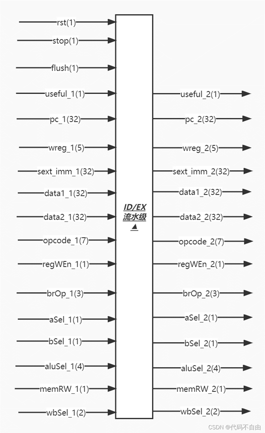 所有输出信号的更新均采用时序逻辑,在时钟上升沿来临时: 当复位信号有效,即rst=1时,或要清空流水级,即flush(EX阶段得到的pcSel)=0时,要将相应的寄存器清零,useful_2设为’b0;pc_2设为32'b0; wreg_2设为5'b0;sext_imm_2设为32'b0;data1_2设为32'b0;data2_2设为32'b0;opcode_2设为7'b0;regWEn_2设为0;brOp_2设为'b111;aSel_2设为1;bSel_2设为1;aluSel_2设为`NOOP;memRW_2设为0;wbSel_2设为`FROM_ALU。 当来自停顿判断逻辑的停顿信号有效,即stop=1时,useful_2设为’b0;pc_2设为pc_1; wreg_2设为wreg_1;sext_imm_2设为sext_imm_1;data1_2设为data1_1;data2_2设为data2_1;opcode_2设为opcode_1;regWEn_2设为0;brOp_2设为brOp_1;aSel_2设为aSel_1;bSel_2设为bSel_1;aluSel_2设为aluSel_1;memRW_2设为0;wbSel_2设为wbSel_1。 其余情况默认将useful_2设为useful_1;pc_2设为pc_1; wreg_2设为wreg_1;sext_imm_2设为sext_imm_1;data1_2设为data1_1;data2_2设为data2_1;opcode_2设为opcode_1;regWEn_2设为regWEn_1;brOp_2设为brOp_1;aSel_2设为aSel_1;bSel_2设为bSel_1;aluSel_2设为aluSel_1;memRW_2设为memRW_1;wbSel_2设为wbSel_1。