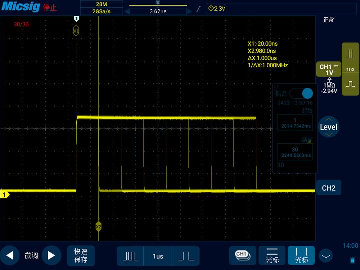 我们打开分段存储的拟合功能,这样示波器会把我们刚才捕获到的30个片段进行重合显示。我们打开示波器光标进行测量,这样我们就可以看出这30段波形中的最小脉宽以及最大脉宽。同时也观察到这几个脉宽的变化间隔大小其实是一样的,都再1μs左右。