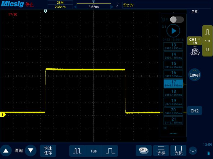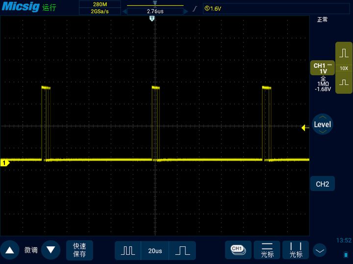 现在,我们应该比较清楚如何让这个波形看起来稳定了,就是只捕获我想要的脉宽大小的波形,其他脉宽不同的波形不显示。比如我们可以采用脉宽触发,将触发条件设置为只捕获小于1点几微秒脉宽的信号,这样如下图所示信号看起来就是稳定的。