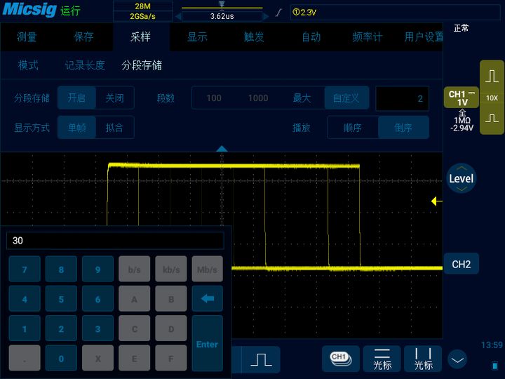 我们将时基重新打小,让示波器只能观察到一个脉冲,然后打开示波器的分段存储功能,设置记录30个波形片段。示波器的分段存储功能类似于多个单次触发的组合,比如我们这里记录30个段数,相当于示波器单次触发了30次,并且每次的波形都可以单独保存观看。