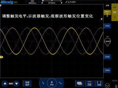 触发电平在示波器显示中为一个电压值,单位是“mV”和“V”,另外在界面上都会有一个触发电平线以指示其相对于信号波形的位置,平板示波器的触发电平调节非常简单,通过手指触摸“Level”上线移动即可。触发电平调节又叫同步调节,它使得扫描与被测信号同步。只有触发电平在信号幅度的范围之内时,信号才可能被触发。