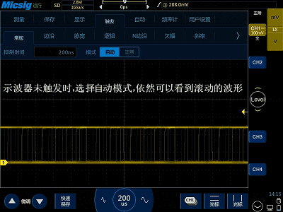 在自动模式下,示波器首先 按照触发条件进行触发,当超过设定的时间没有触发条件时,示波器将强制触发,显示信号。当我们对一个信号的特征不了解时,就应该选用“自动模式”,这种模 式可以保证在其他触发设置都不正确时示波器也会有波形显示,尽管波形不一定是稳定的,但是可以为我们进一步调节示波器提供直观的判断。