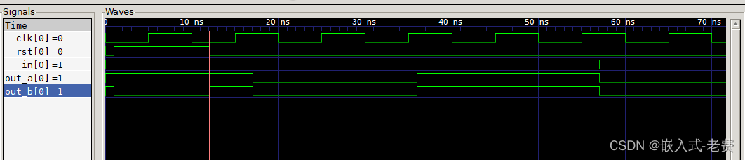 这里的out_b从类型上看,好像是register。但是它的触发条件却是always(*),这就意味着,在这段电路描述中,只要rst或者in发生改变,out_b就会随之改变。这不就是组合逻辑的思路吗?同样,可以借助于gtkwave观察下图形确认一下,