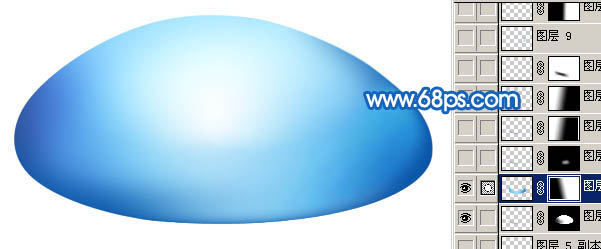 <图4> 3、新建一个图层,用钢笔勾出图5所示的选区,按Ctrl + Alt + D 羽化25个像素后填充颜色:#0B56A9,然后调成“水珠主体”选区,按Ctrl + Shift + I 反选,按Delete 删除多出部分,效果如图6。