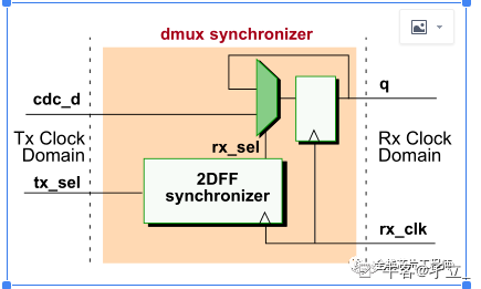 控制信号tx_sel经两级寄存器同步后作为多路选择器的sel信号,cdc_d为发送时钟域多比特数据。tx_sel信号与cdc_d信号都需要持续一定的时间以保证能被接收时钟域采到。