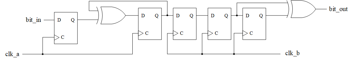 T触发器的真值表达式为 Qn+1 =T⊕Qn。总结来说的话,就是每来一个周期的高电平,输出就翻转一次。我们利用这个特性,可以将单比特的信号展宽。就是说在两个脉冲之间的信号是保持不变的,不管保持的是0还是1并不重要,我们只要知道脉冲到来之时,T触发器的输出会翻转就足够了。只要信号发生了变化,我们在进行同步的时钟域多打一拍,并与前一拍的信号进行异或就可以得到一个周期的脉冲,虽然b时钟域采到的并不是脉冲,但是异或之后得到的就是一个脉冲。