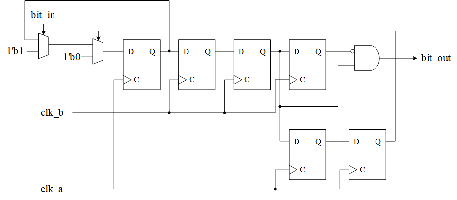 这种方法的本质实际上是将信号展宽,只不过展宽的信号可能是0也可能是1。但很显然,a时钟域的两个脉冲间隔要足够大,因为两个脉冲的信号的间隔就是a时钟域的信号持续的时间。如果这个时间太短,在b时钟域是无法采到的。两个脉冲之间的间隔要大于Tb+Thold+Tsetup,其中Tb为b时钟域的时钟周期,Thold与Tsetup分别为b时钟域寄存器的保持时间和建立时间。