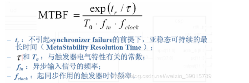 触发器进入亚稳态的时间用参数 MTBF(mean time between failures,平均无故障时间)描述,MTBF与触发器的时钟频率密切相关,甚至受到时钟频率的影响极大,但亚稳态发生的概率与时钟的频率无关,只是MTBF与触发器的时钟频率有密切联系。 MTBF即触发器采样失败的时间间隔,其公式如下: