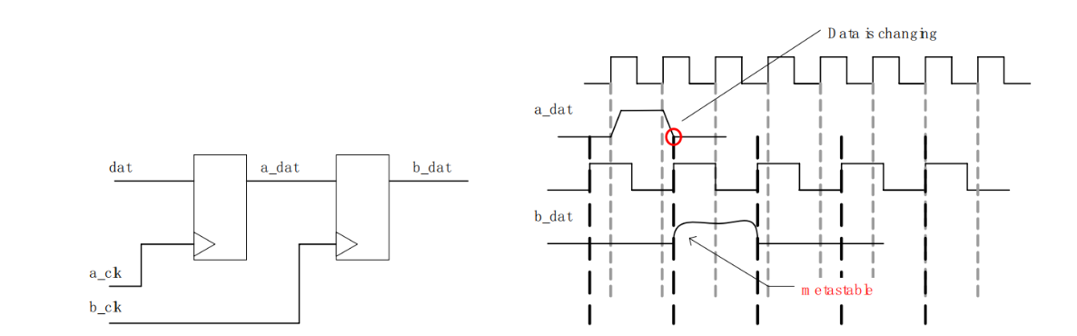 2)多级寄存器(打两拍),处理单bit数据的跨时钟域问题