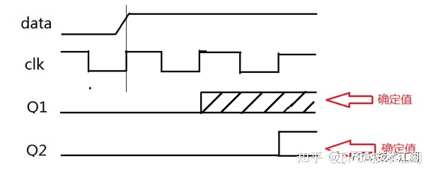 data是时钟域1的数据,需要传到时钟域2(clk)进行处理,寄存器1和寄存器2使用的时钟都为clk。假设在clk的上升沿正好采到data的跳变沿(从0变1的上升沿,实际上的数据跳变不可能是瞬时的,所以有短暂的跳变时间),那这时作为寄存器1的输入到底应该是0还是1呢?这是一个不确定的问题。所以Q1的值也不能确定,但至少可以保证,在clk的下一个上升沿,Q1基本可以满足第二级寄存器的保持时间和建立时间要求,出现亚稳态的概率得到了很大的改善。