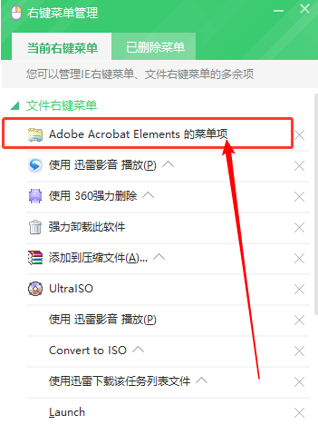 5、经过多次的删除然后恢复测试,发现是 “Adobee acrobat Elements的菜单项”在捣乱,所以要将它删除。关闭等待1分钟,开始测试,右键一直转圈问题立马消失。